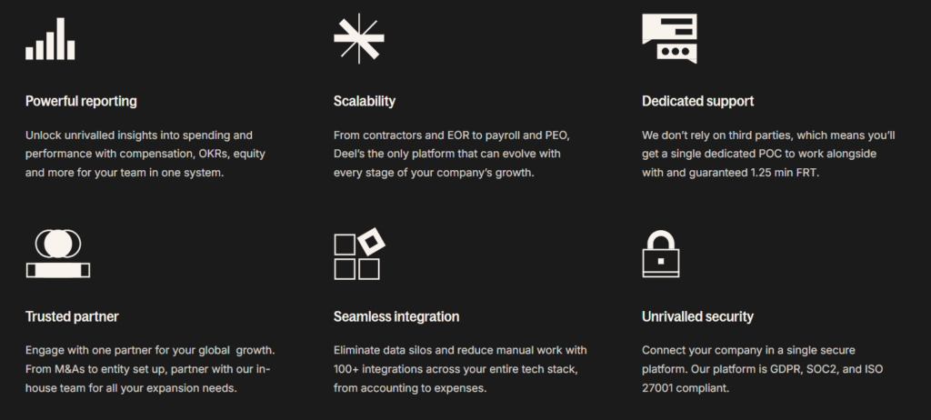 This combination reduces overhead costs, improves scalability, and lets companies focus on core operations while Deel handle administrative and operational complexities efficiently. It boosts productivity and cost-effectiveness.