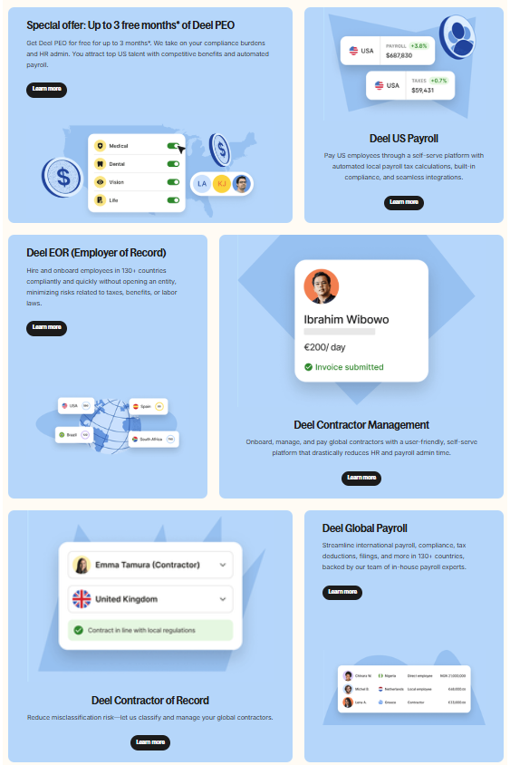 Deel is built to scale with organizations of all sizes. Whether you want to hire worldwide without opening legal entities, streamline HR for your global team, or pay all types of workers anywhere with consolidated payroll—Deel does it all with full compliance.